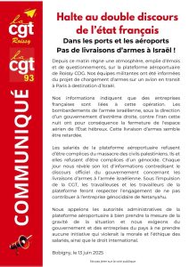 Depuis ce matin règne une atmosphère, emplie d’émois et de questionnements, sur la plateforme aéroportuaire de Roissy CDG. Nos équipes militantes ont été informées du projet de chargement d’armes sur un avion en transit à Paris à destination d’Israël. Nos informations indiquent que des entreprises françaises sont liées à cette opération. Les bombardements de l’armée israélienne, sous la direction d’un gouvernement d’extrême droite, contre l’Iran cette nuit ont eu pour conséquence la fermeture de l’espace aérien de l’état hébreux. Cette livraison d’arme semble être retardée.